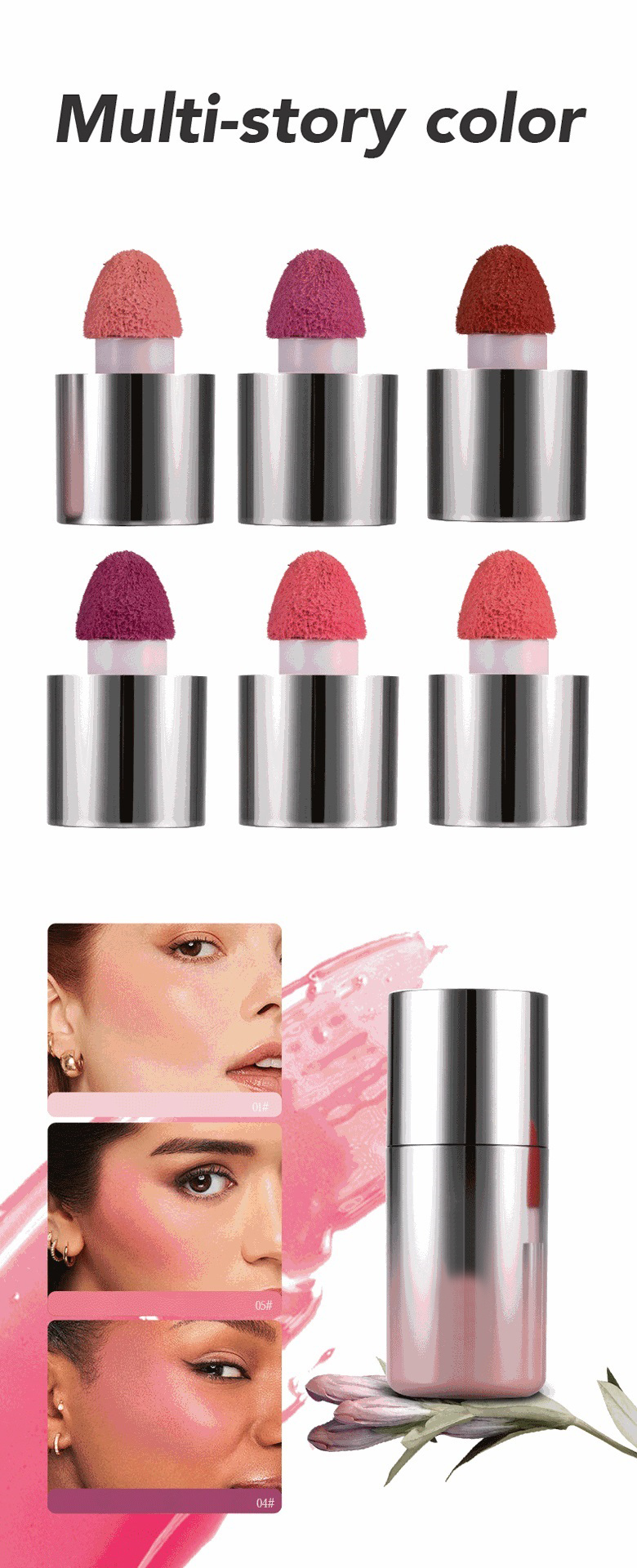 ①Lightweight texture:Adopting a unique liquid texture,it is lightweight and breathable.It glides easily onto the skin and adheres closely to it. It eliminates the drawbacks of traditional blushes,such as heaviness and powdery fallout.