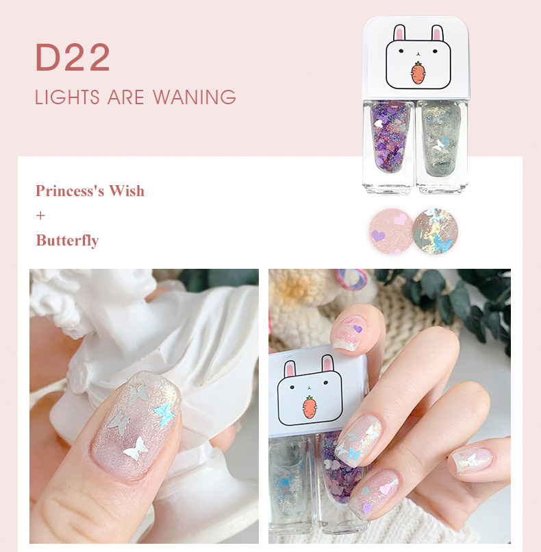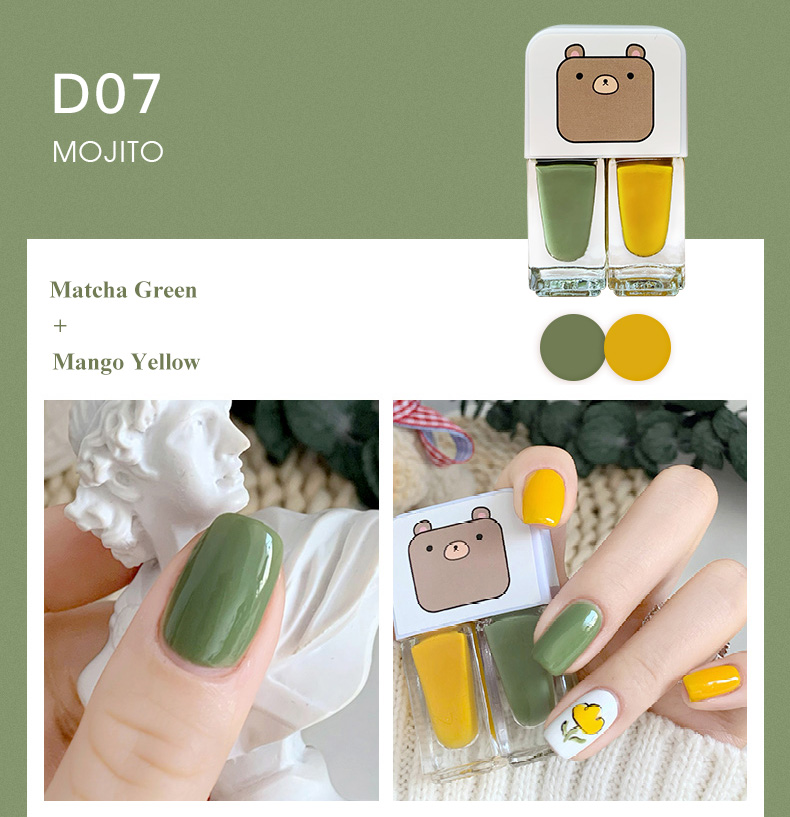 Maxfine Gemini Water-based Nail Polish,with each set containing two bottles of nail polish,which adopts a water-based formula,with a mild scent and no pungent odor,it also has a peelable and tearable feature,thus reducing damage to nails.